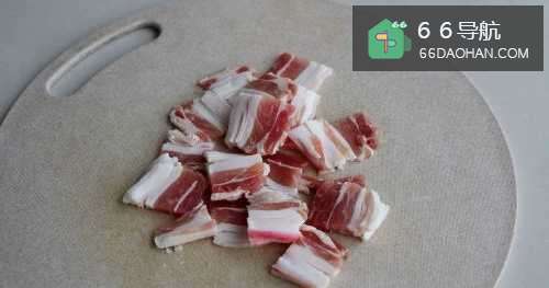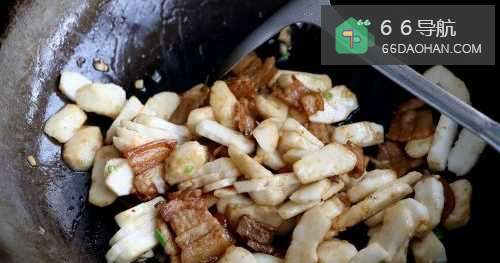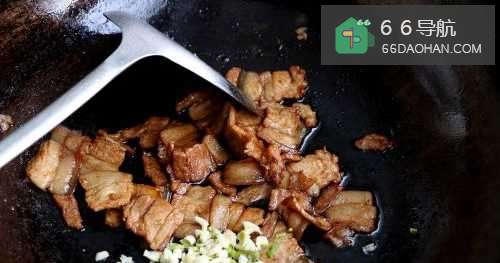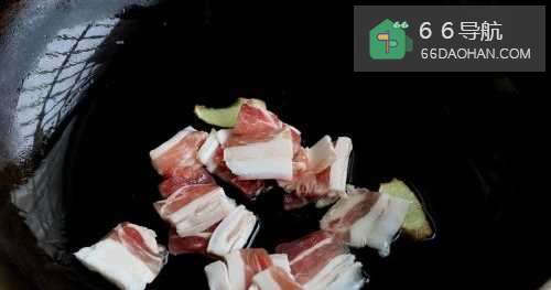 5炒锅内放适量的色拉油,放入姜片,放入五花肉片翻炒均匀;