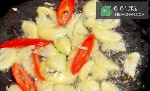 2蒜头切片,锅里1大匙的食用油,加入蒜片,辣椒爆香。