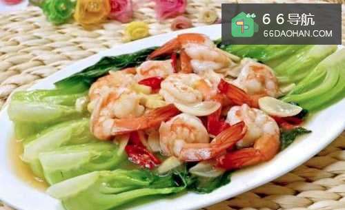 上海青洗净切开为1/4,在热水里滴入少许油及加入少许盐烫熟后摆盘备用,接着把虾仁稍微川烫一下泡冰水备用。