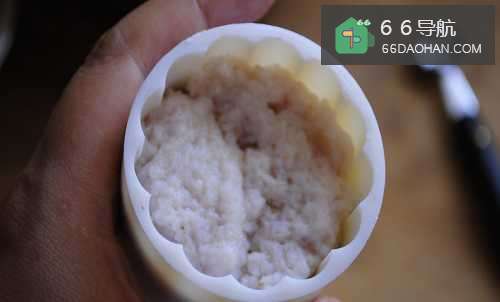 7将月饼模装好花片,先用勺子挖适量的紫薯泥并按实。