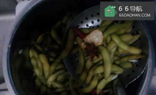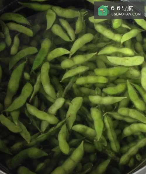 2水开后,将沥好水的毛豆下入锅中,待毛豆在沸水中翻滚煮起。