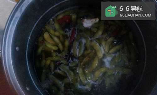 3此时将盐、鸡精、红辣椒、橘皮、茴香、大料、葱花等调料下入,口味喜欢辣味重一点的,可以多放些辣椒进去。