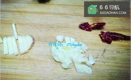 5准备少许辅料生姜、蒜头、辣椒干,分别将其加工成蒜末、姜丝、辣椒段。
