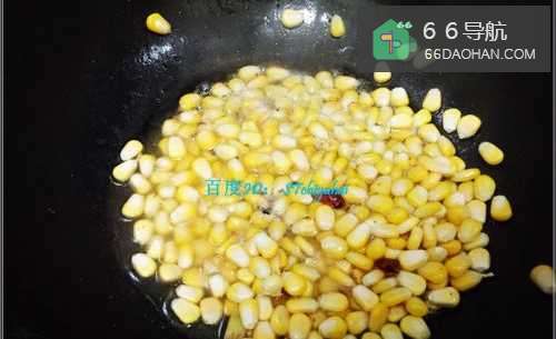 6先控制油温,不宜过高,加入玉米粒稍微榨一下,带玉米粒膨胀之后加入前面洗好的包菜叶。