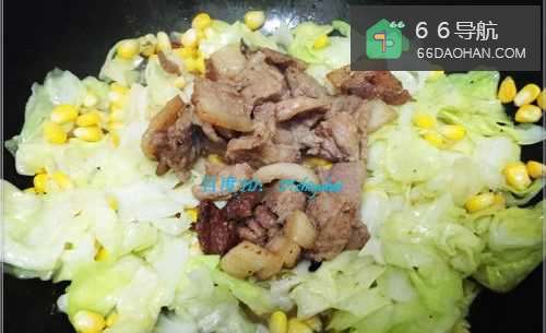 7大火快炒一会,将包菜叶炒软,然后倒入前面腌制的腿肉,混合炒,加入各种调味料,将其炒匀,试试味道,合适后就可以装盘了,一盘美味可口的玉米粒炒包菜就做好了。