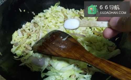 5接着放包菜,调拌均匀,加点食盐调味,酱油上色!