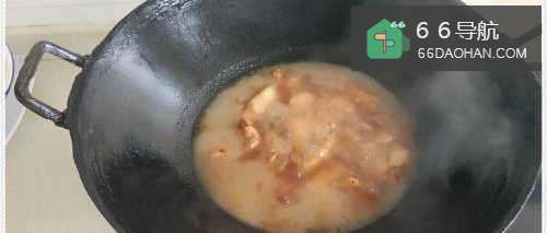 锅中加入60毫升的食用油,将猪肉煸炒至金黄色,倒入800毫升的水。