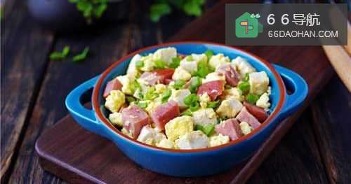 再倒入蛋液,裹着豆腐一起翻炒,最后放入火腿翻炒即可。