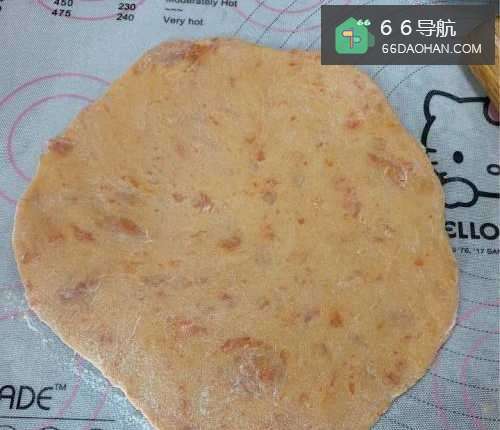 和成面团,发酵30分钟,之后将之后将面团分成6份剂子,其中两份稍微大一点,擀成薄片。