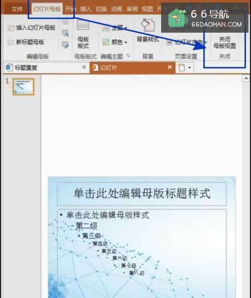 6这样就可以看到插入背景之后的幻灯片效果了,在菜单栏中点击【关闭母版视图】按钮,即设置完成。