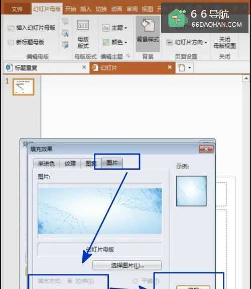5点击【确定】后,会跳回到”背景“对话框,【示例】下方会显示母版图片的效果,点击【应用】按钮,如图所示