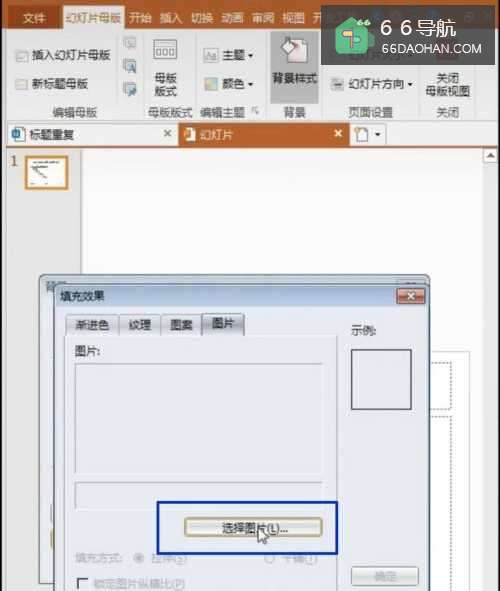 2点击【填充效果】之后,出现一个“填充效果”对话框,点击【图片】然后点击【选择图片】按钮,如图所示