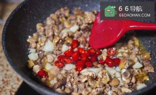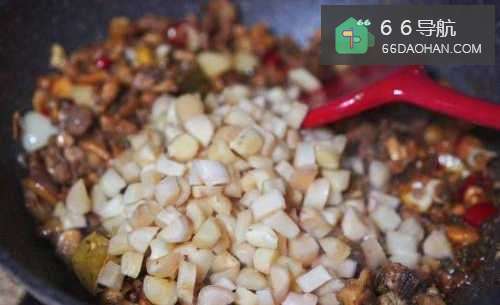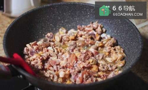 3将炒出多余的水分倒出来,将冰糖放进去翻炒片刻