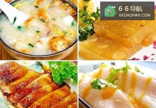 传统的粤菜就不说了,乳猪,盐锔鸡,叉烧,白云猪手,鱼丸,牛丸,鱼肚,烧鹅烧鸭,手撕鸡,早茶,各种点心,萝卜牛腩,鹅肠,各种海鲜,燕窝鱼翅鲍鱼……但极具代表性的小吃有三道艇仔粥、马蹄糕和蒸肠粉。
