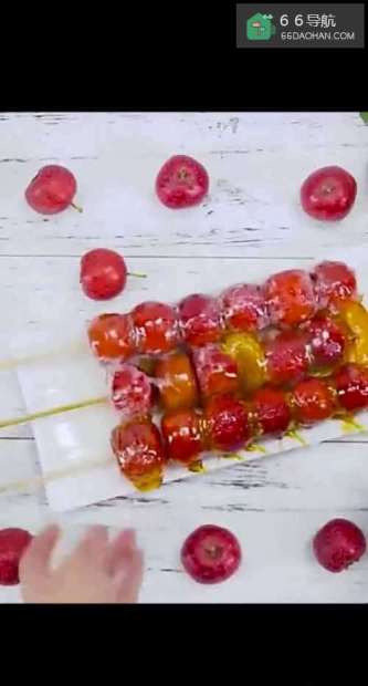 3将穿好的串,放入熬好的糖中翻滚,反复几次至四周均裹上糖浆。