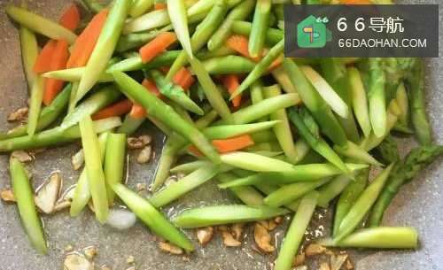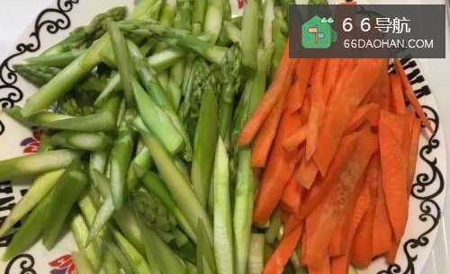 4煮一锅水,水滚先放红萝卜丝入锅,等水再次滚起来时再放芦笋,芦笋入滚水约10秒即可捞起