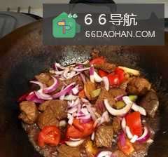 4待牛肉上色均匀后,把洋葱丝、西红柿块倒入锅中。