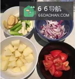 2分别把胡萝卜、土豆去皮切块,西红柿切块、洋葱切成条状。