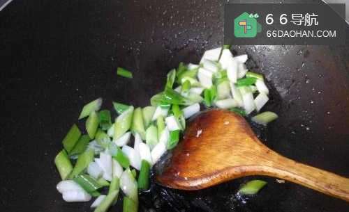 3起锅热油,油温七八分热时,倒入大葱和红椒丝,翻炒