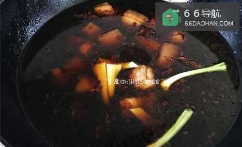 9在五花肉的锅里加入清水,把葱白和姜片放入进去炖30分钟。