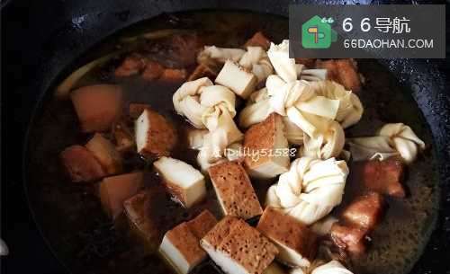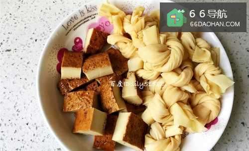 2准备好香干和百叶结分别洗干净,百叶结是买扎好的,把香干切成小块就可以了。