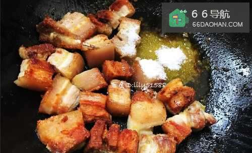 6五花肉的几个面都煎得差不多的时候,放入白糖炒几下。