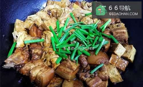 11五花肉锅里还有一些些汤汁时,加入少许盐,放入葱叶炒均匀关火。