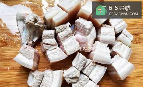 5把五花肉捞出来切成块,然后放入锅里不要放油,用小火慢慢煎一下。