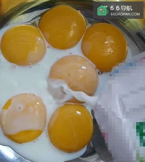 2再将装蛋黄的马斗里加入60克的纯牛奶,一般的纯牛奶就行,再加入45克的食用油,用筷子等物品搅拌均匀