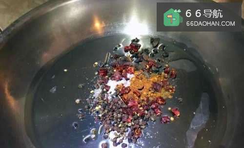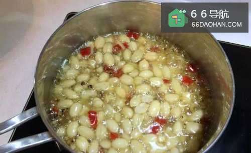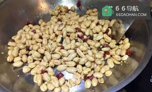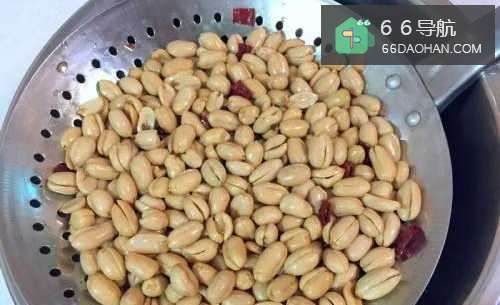 5放入花生、辣椒、花椒等,用小火边炸边翻动,炸至微微金黄色即可起锅沥干油