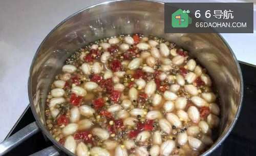 花生米清洗干净,加入浸泡的所有食材一起由冷水开始煮到沸腾后熄火