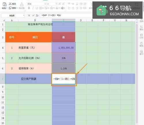 3选择单元格【C6】,根据房屋所在地的标准,输入【适用税率】。