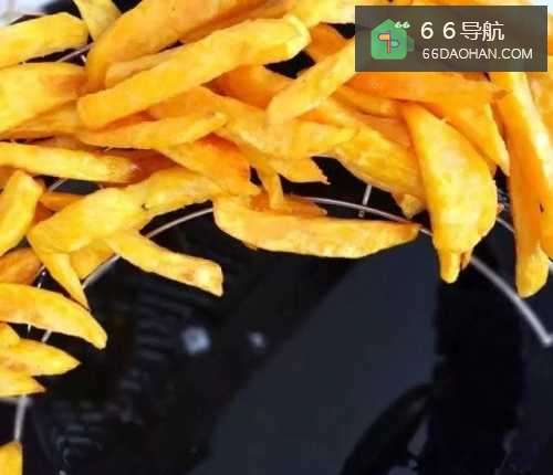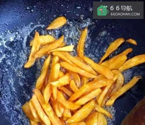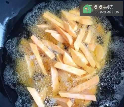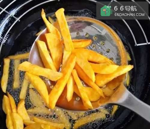 3将切好的红薯倒入油锅中,炸成金黄色。