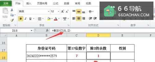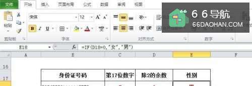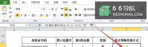5综合上述四个步骤,用一个Excel公式即可完成,即=IF(MOD(MID(B18,17,1),2)=0,"女","男")
