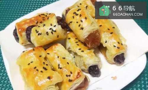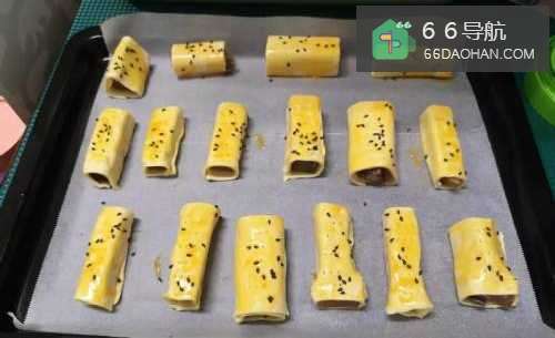 3将年糕卷入酥皮中,上面用叉子戳洞,在烤盘上铺烘焙纸,依序放好卷好的年糕,刷上蛋黄液,撒上芝麻