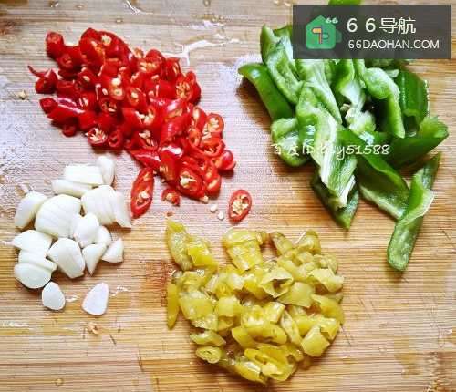 4准备好红尖椒、青椒、泡椒和大蒜,分别切好备用。
