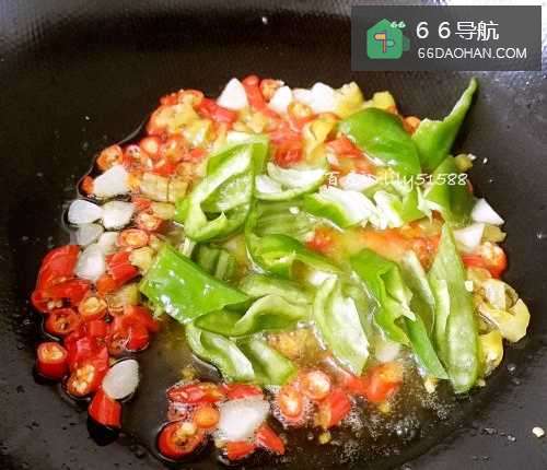6大蒜和红椒翻炒几下之后,放入青椒和泡椒。