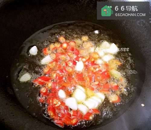 5烧热锅,多放一些油,然后放入大蒜和红尖椒炒香。