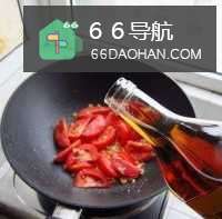 66、将切好的西红柿倒进鸡蛋里面,翻炒几分钟,待西红柿出汁了,加点盐,放点调味的调料。