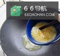 44、待油温上来了,发出滋滋滋的响声时,撒点葱花进去,稍微搅拌一下,将弄好的鸡蛋倒进去。