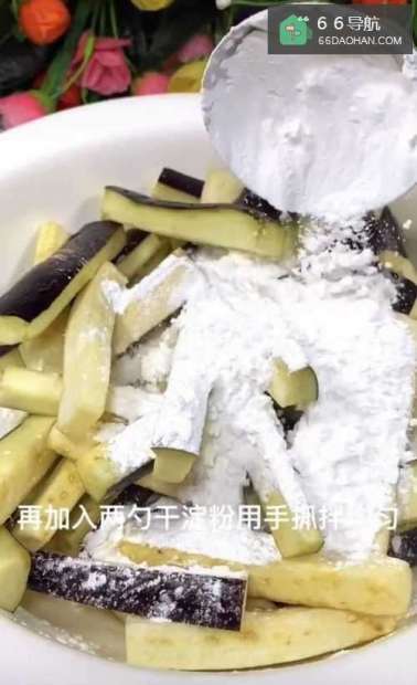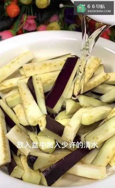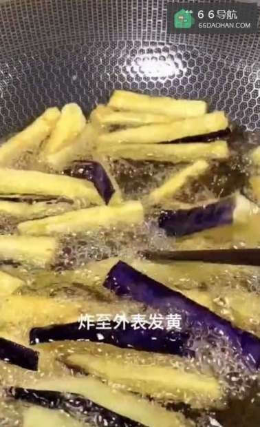 5起锅烧油,油温六成热左右倒入茄子,开大火,炸至外表面金黄,捞出备用,