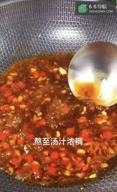 7接着倒入调好的料汁,熬至汤汁浓稠,