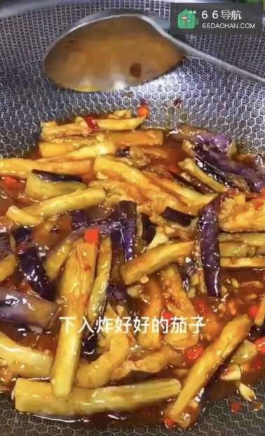 8然后倒入炸好的茄子,大火翻炒均匀入味,