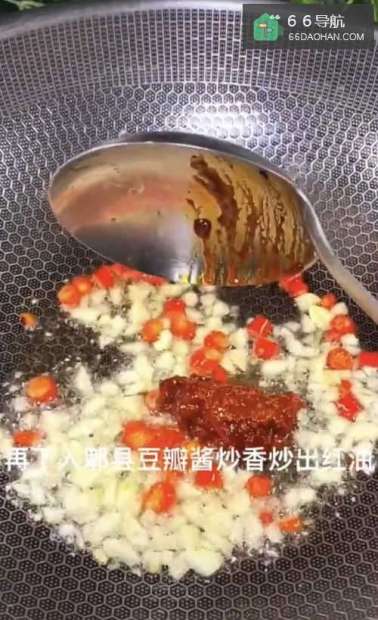 6锅里留底油,下入蒜末,小米辣爆炒出香味,再加入豆瓣酱炒出红油,