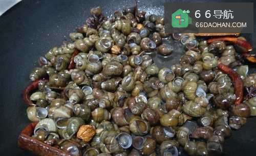 5倒入田螺,翻炒几分钟,加入适量食盐,生抽,白砂糖,老抽,蚝油,干辣椒翻炒均匀;