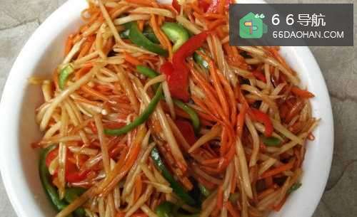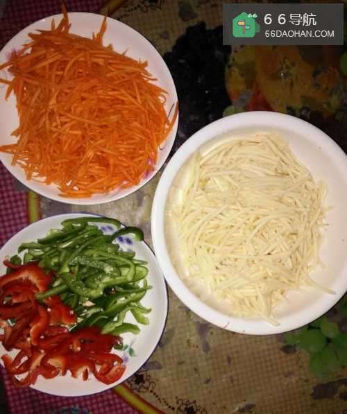 5放入土豆丝和胡萝卜丝爆炒,再放入酱油和食盐,之后放入柿椒丝炒至7分熟,放半勺白糖,放醋起锅,撒上味精