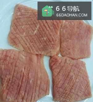 2瘦肉切厚片,两面用刀背排剁留有痕迹即可