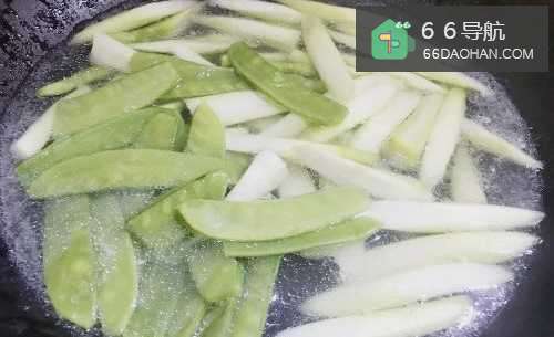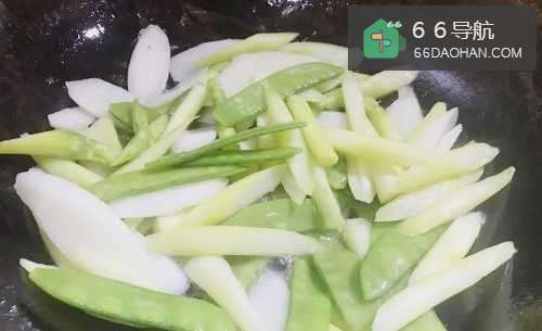8热锅下油,下焯过水的淮山、豌豆和芦笋,翻炒23分钟。