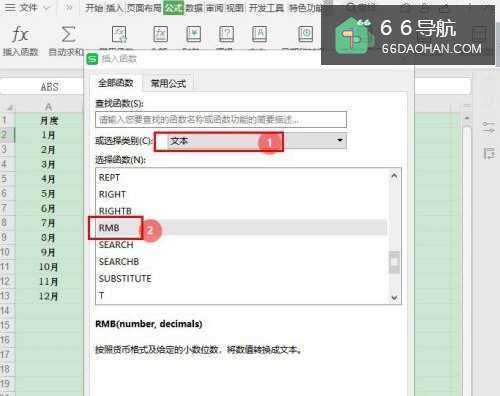 3在“插入函数”窗口,选择函数类型【文本】—【RMB】函数,点击【确定】;