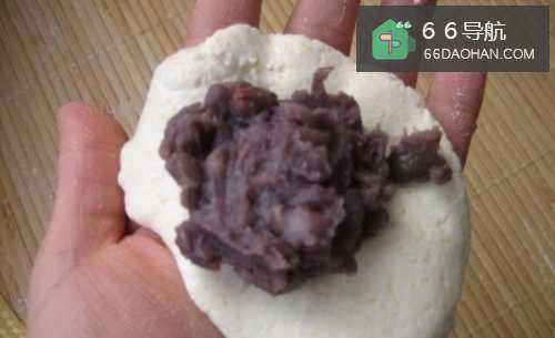 5捏下来一小团面团,用双手压扁,然后用勺子取适量的豆沙,放在中间。